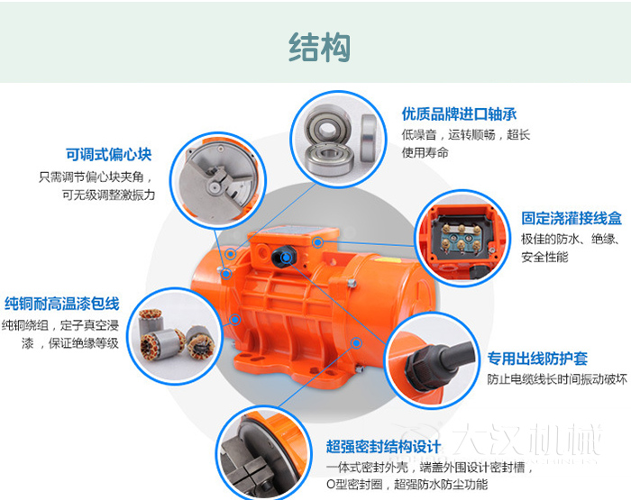 本產品具有技術含量高,體積小、質量輕、噪音低、激振力并可調節,使用維修方便,耐振力強,使用壽命長,啟動迅速,停車平穩,全封閉結構等特點,并適用各種制動方式,如能耗制動,反接制動等。